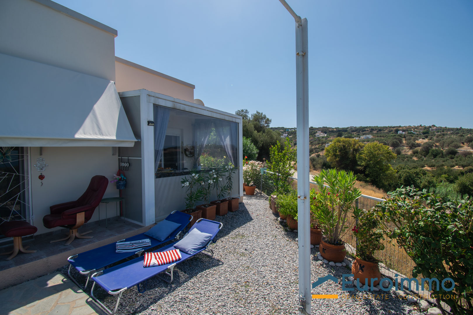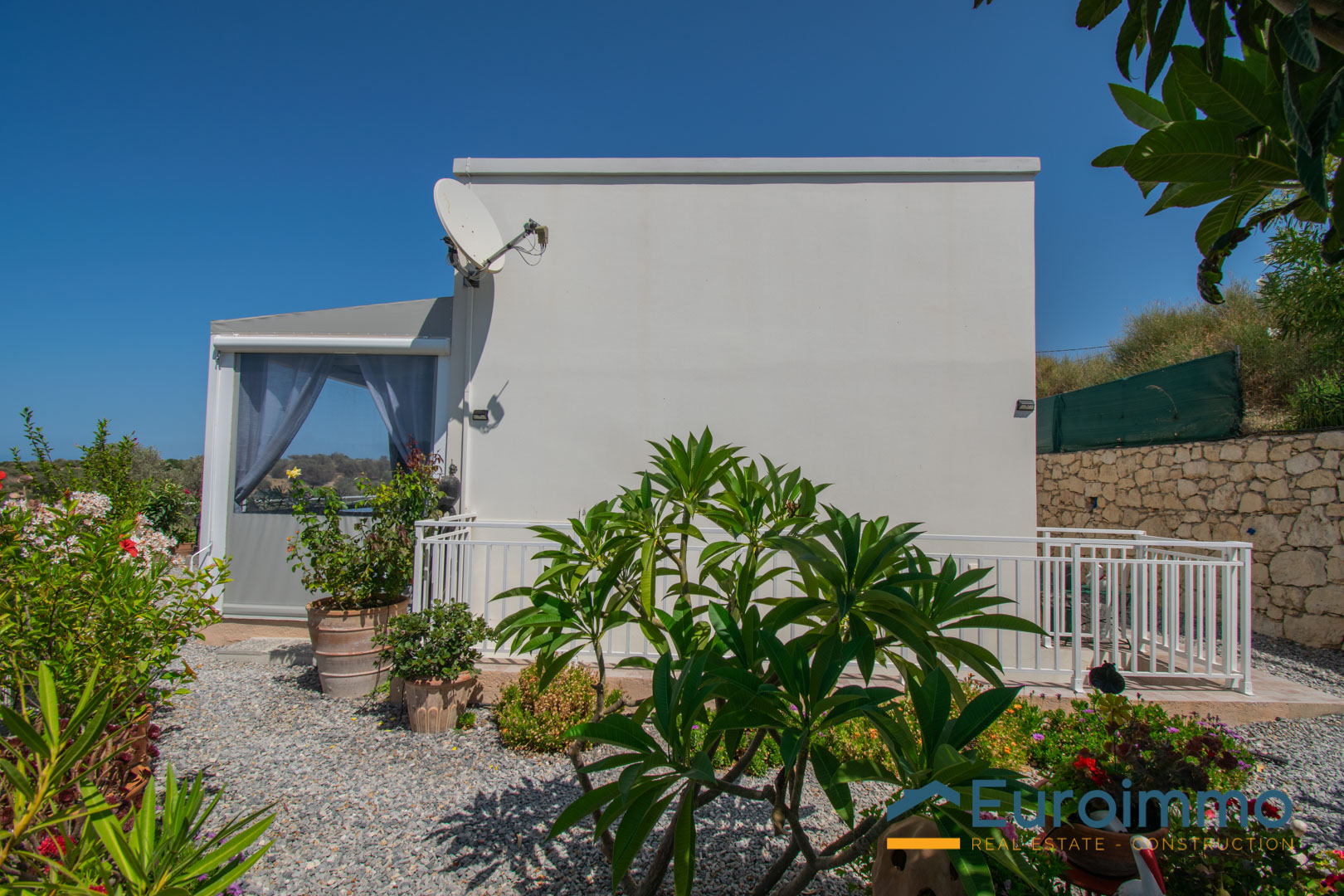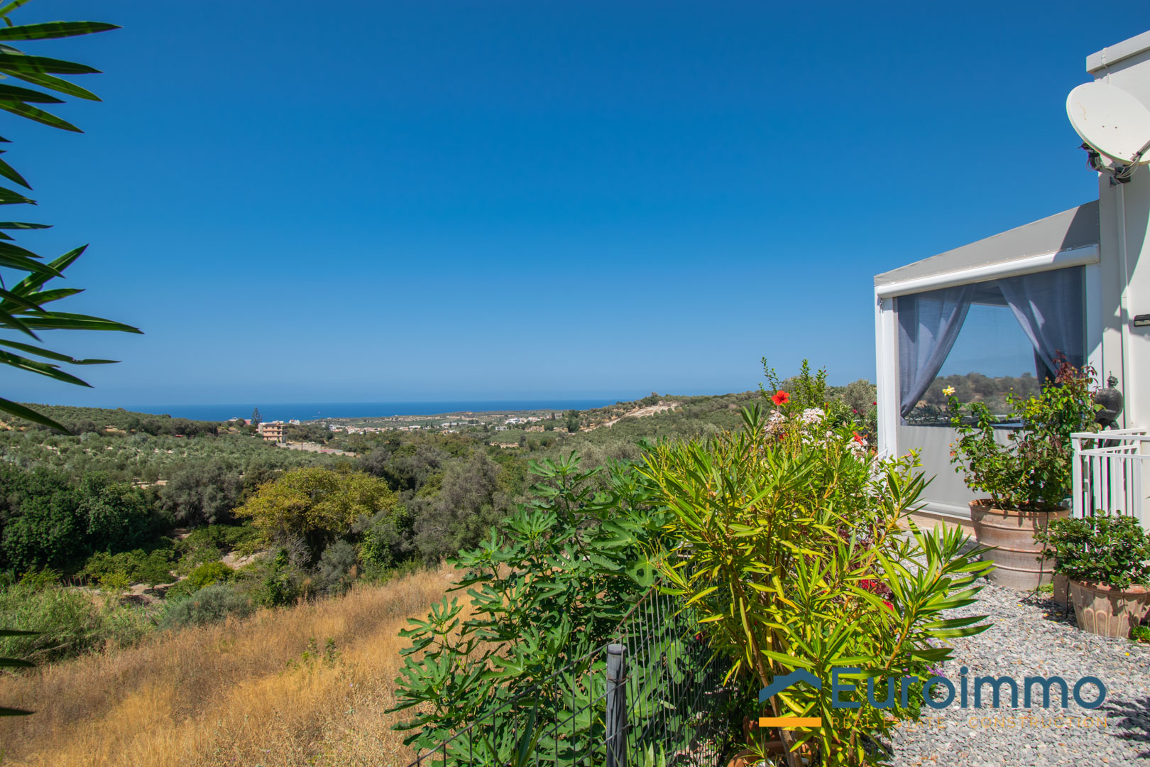 Ampie porte-finestre si aprono dalla zona giorno su una veranda coperta, perfetta per pranzi e cene all’aperto o per rilassarsi ammirando l’incredibile vista sulla valle e sul mare. La proprietà è circondata da uno splendido e colorato giardino ricco di piante mediterranee.