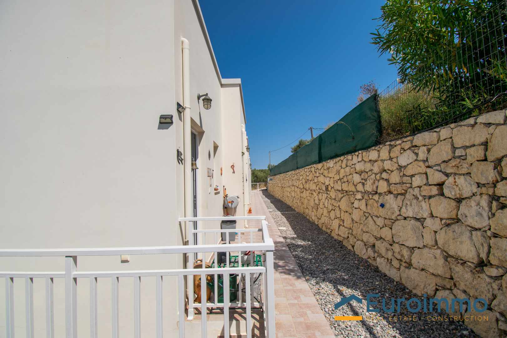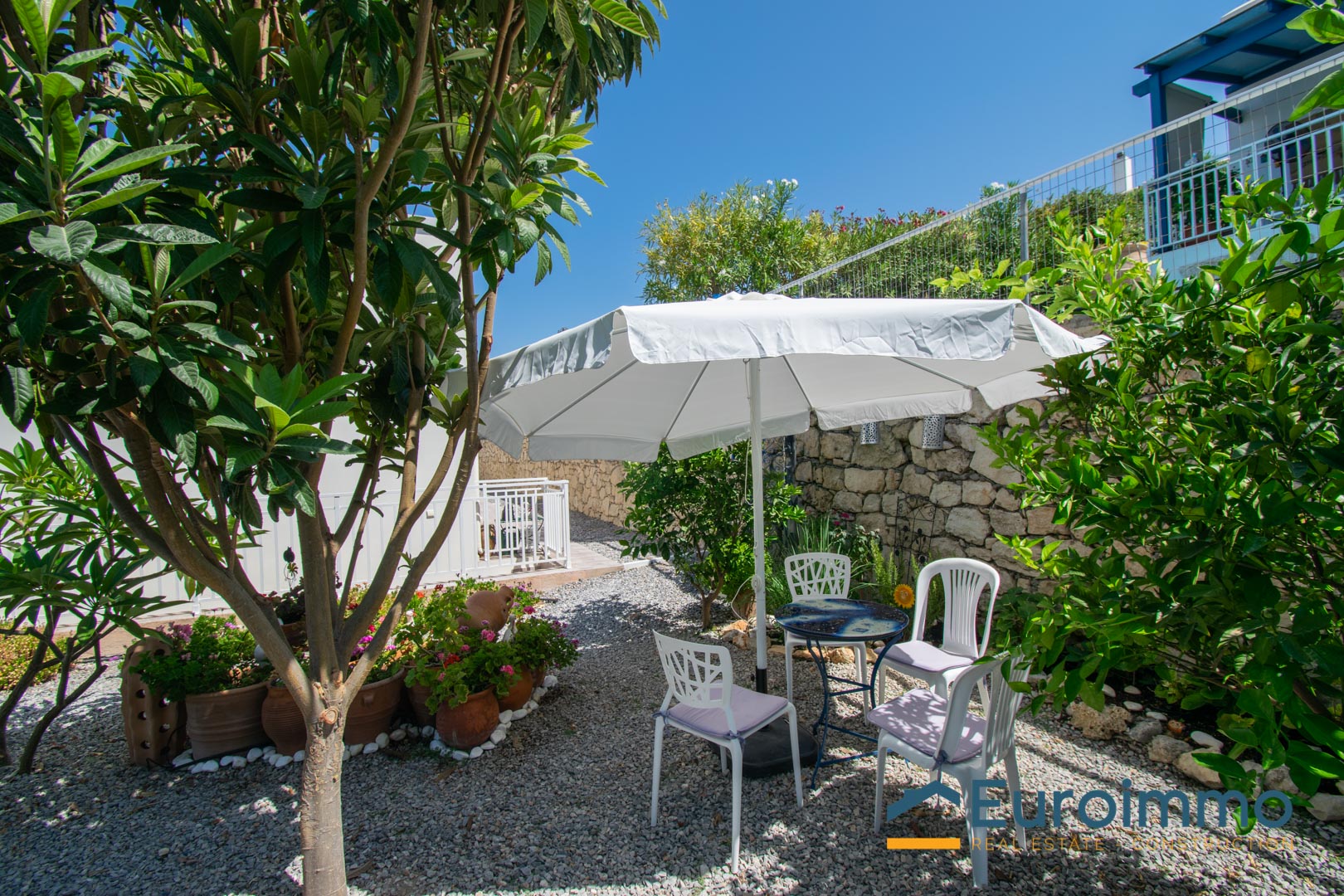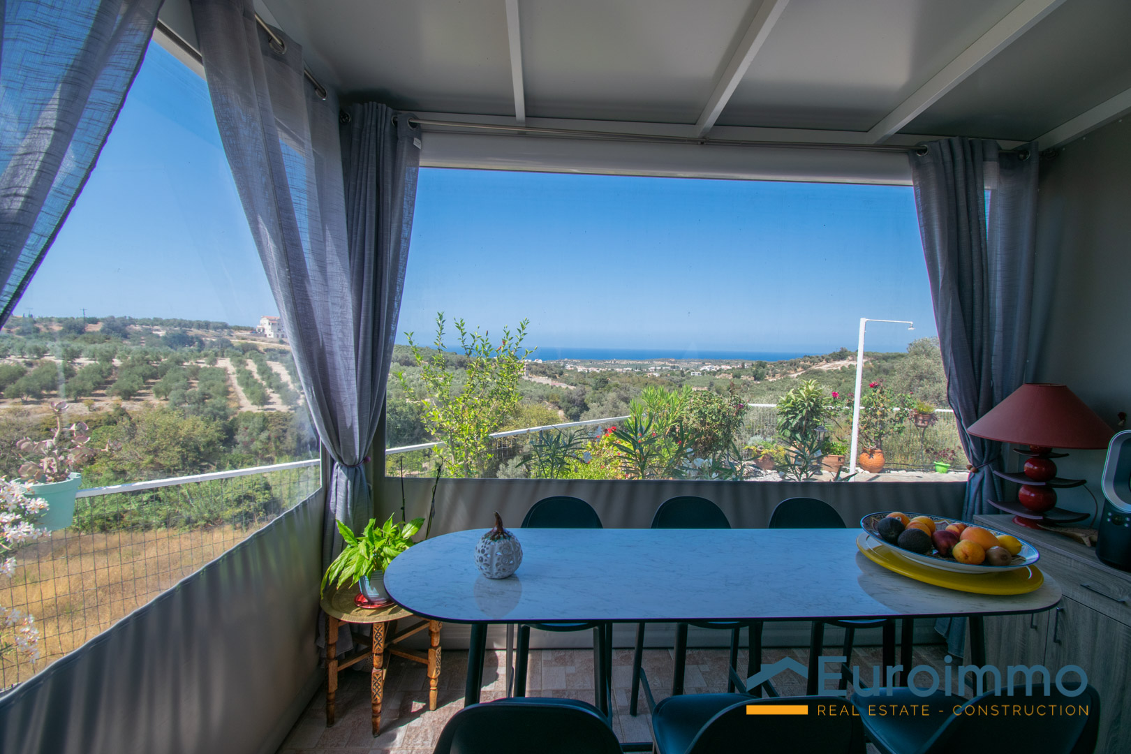 Ampie porte-finestre si aprono dalla zona giorno su una veranda coperta, perfetta per pranzi e cene all’aperto o per rilassarsi ammirando l’incredibile vista sulla valle e sul mare. La proprietà è circondata da uno splendido e colorato giardino ricco di piante mediterranee.