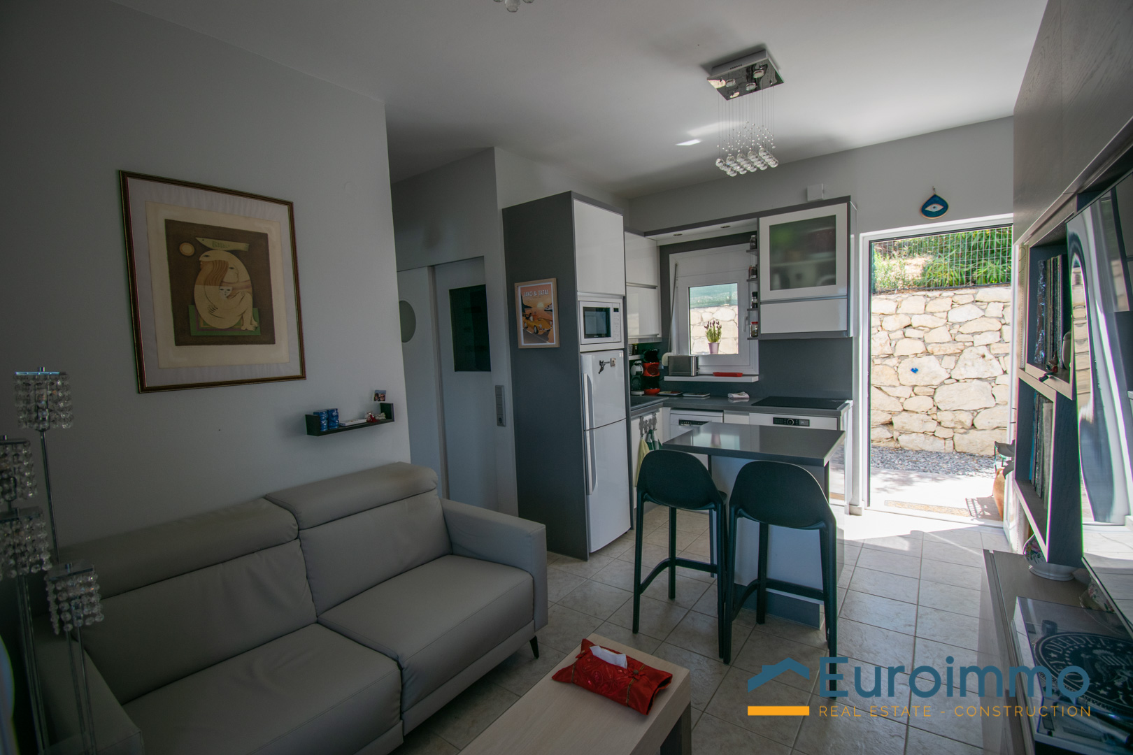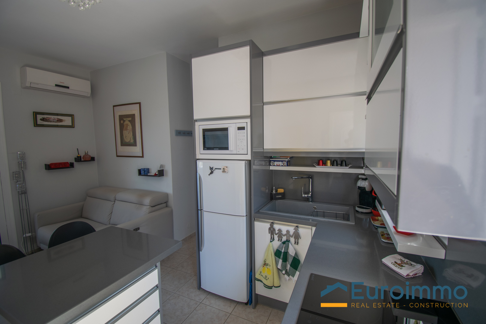 All’interno, la disposizione è intelligente ed efficiente. Dispone di due comode camere da letto e un bagno moderno. La zona giorno si apre su un’elegante cucina completamente attrezzata con tutto l’essenziale, rifinita in un pulito stile bianco e grigio.