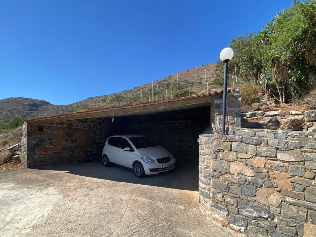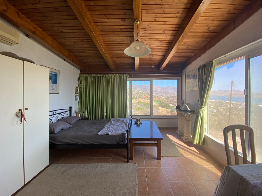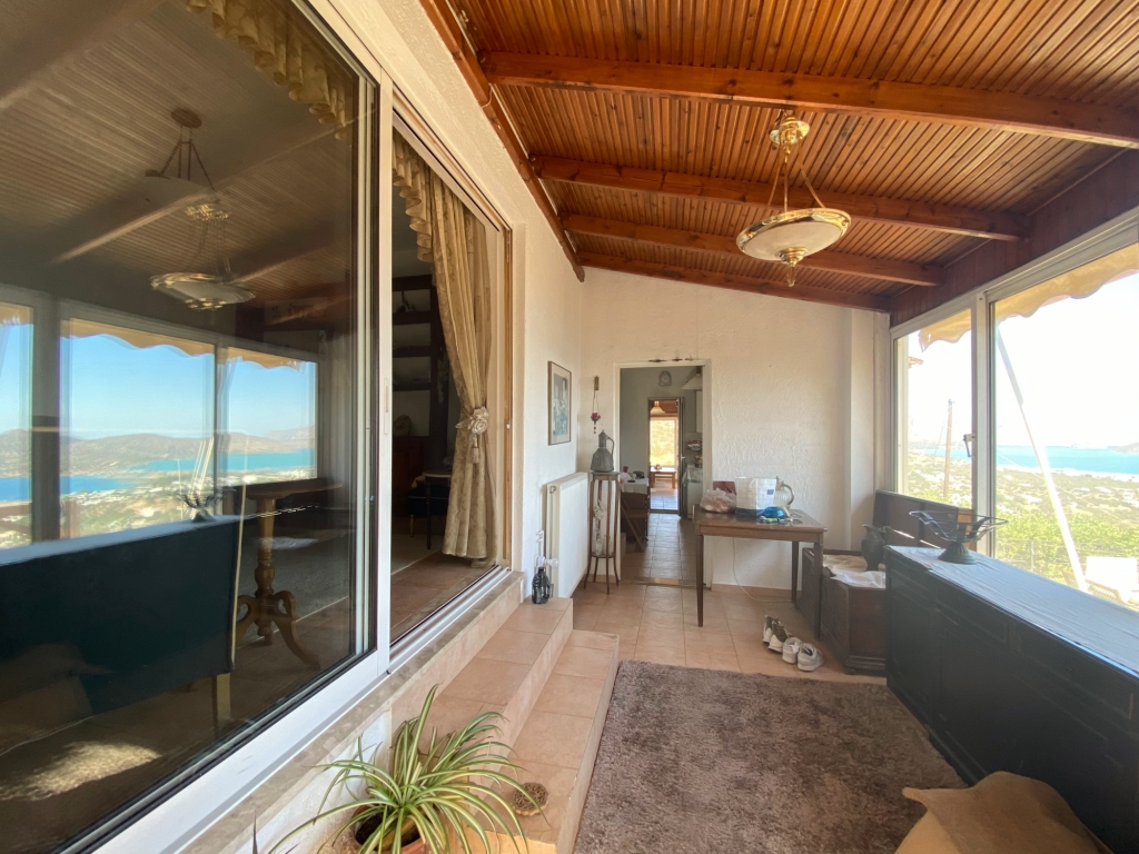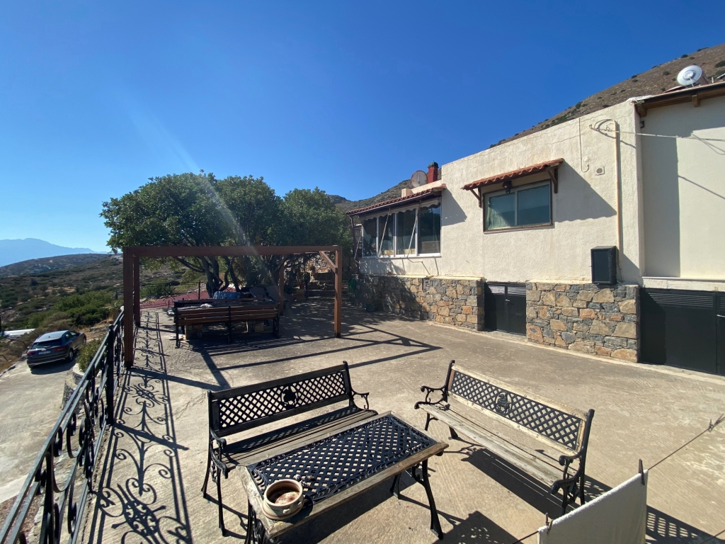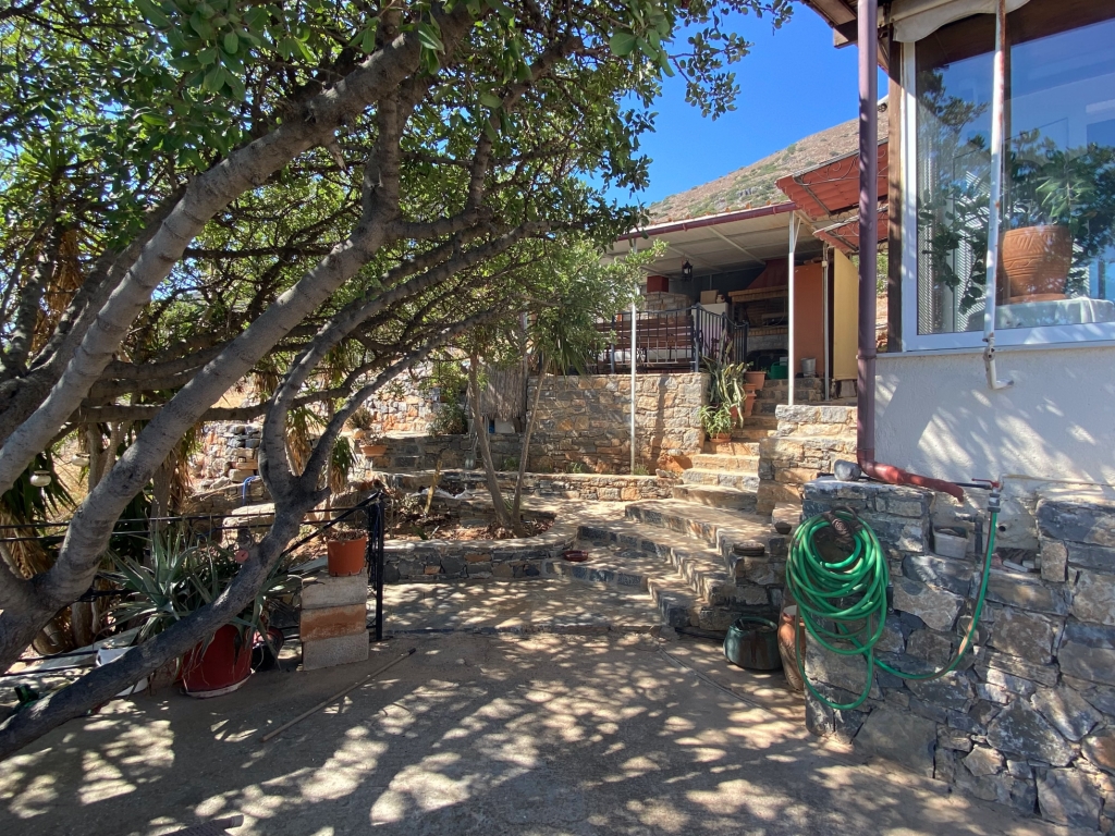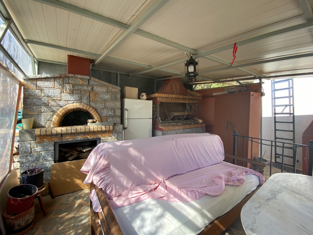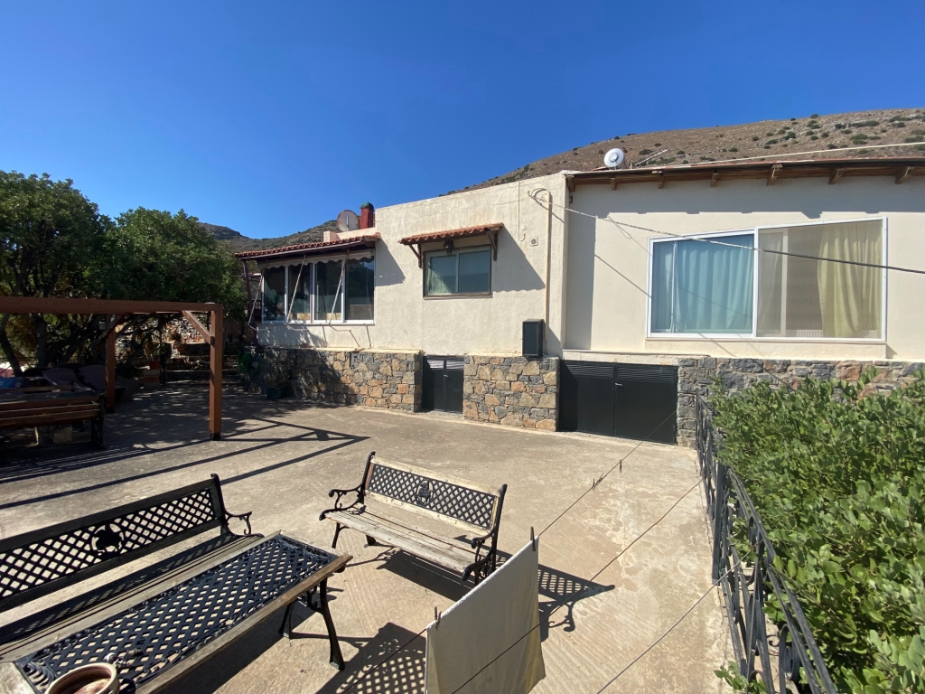 A detached house of 88m2 is available for sale just 350 meters from the beach and 9 km from the city of Agios Nikolaos, the capital of Eastern Crete. It is developed in a wonderful location within a land of 3.800m2 with the possibility of configuring the outdoor areas or cultivating the land as the new owner wishes. It opens to a hallway that leads to the kitchen, a WC and a bedroom with large windows offering an unparalleled view. Going up two steps we find the living room with fireplace and a bedroom with an en-suite bathroom. It includes a wooden ceiling, central heating, air conditioning and solar. Outside there is a closed barbecue area that also includes a wood-burning oven. For vehicles there is a closed parking space with a capacity of three vehicles and an open one for three vehicles. The panoramic view it offers makes it an excellent choice as a permanent or holiday residence even for its exploitation.