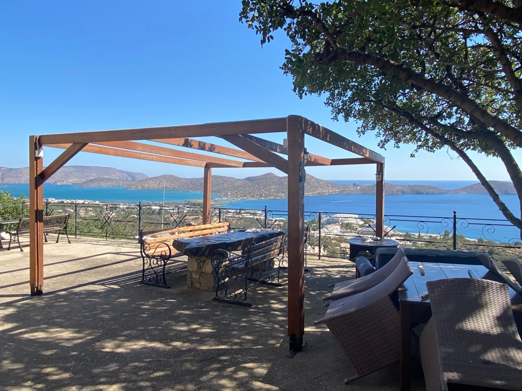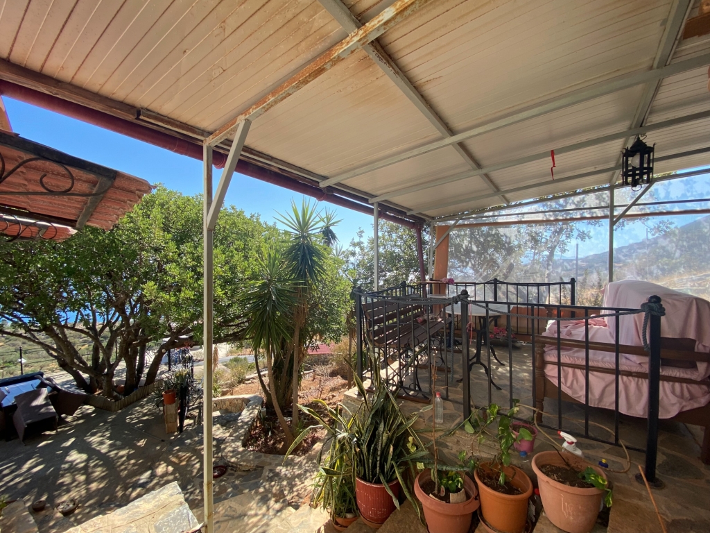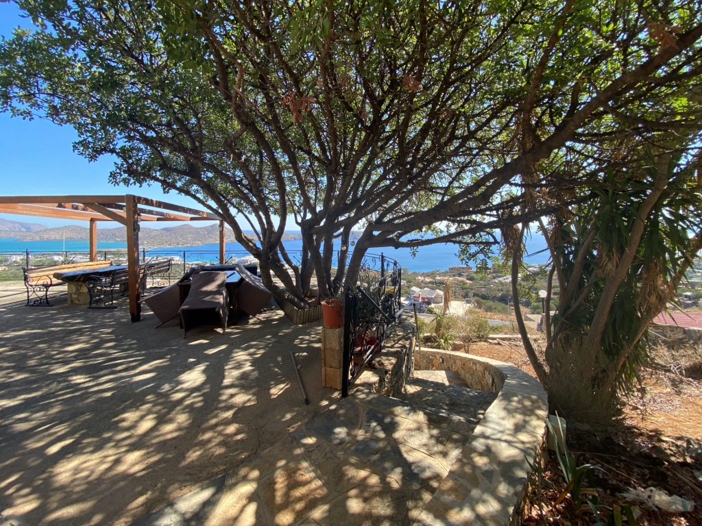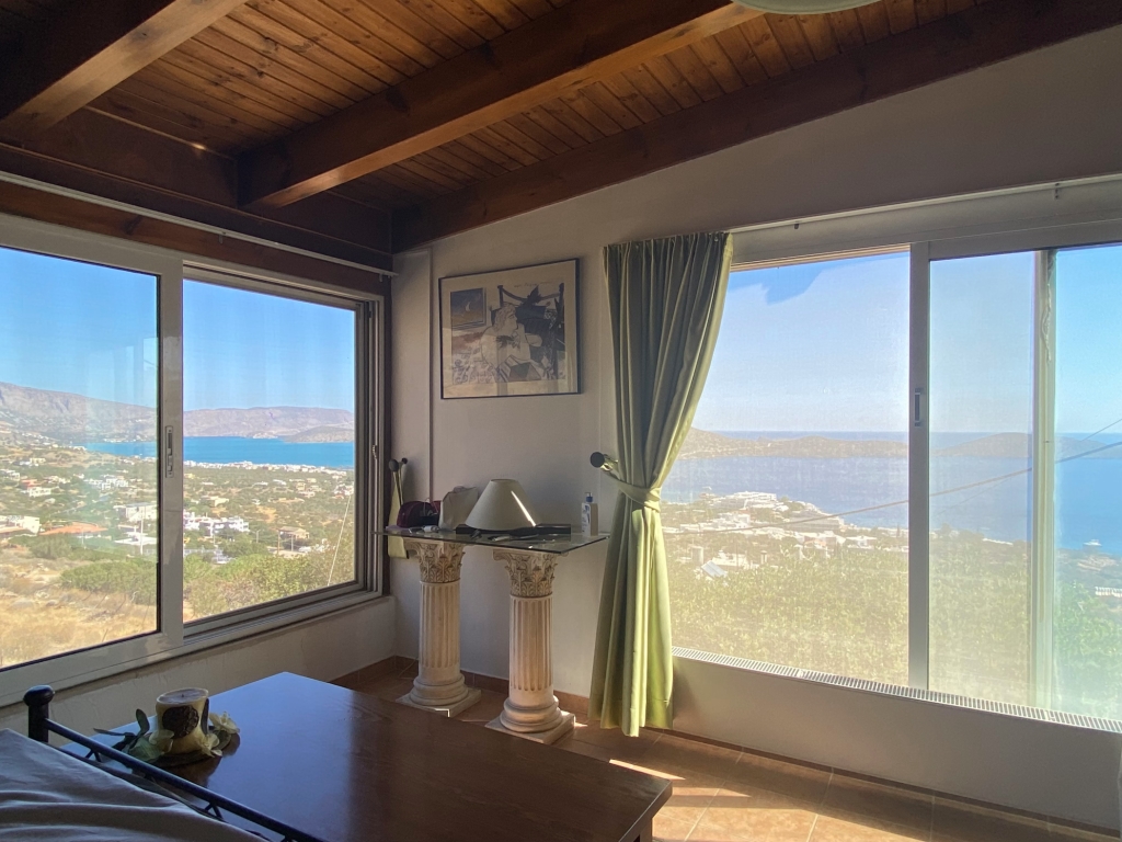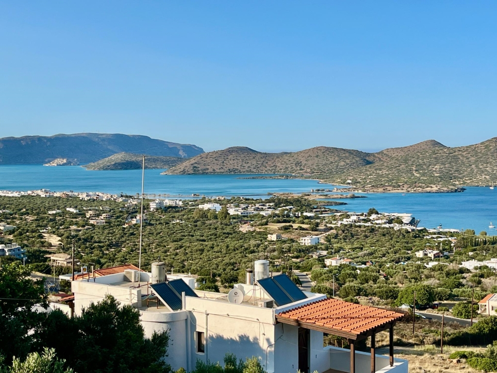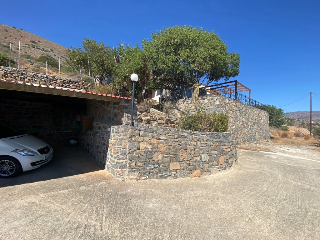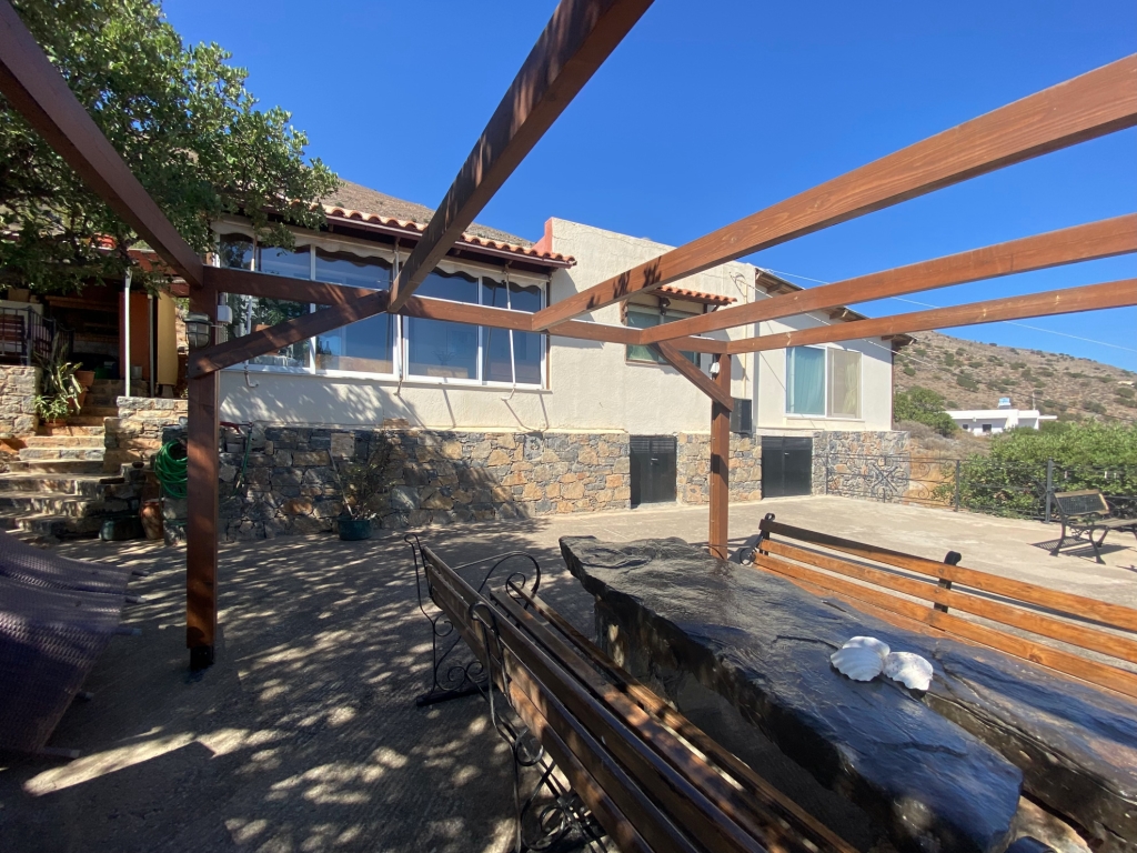 A detached house of 88m2 is available for sale just 350 meters from the beach and 9 km from the city of Agios Nikolaos, the capital of Eastern Crete. It is developed in a wonderful location within a land of 3.800m2 with the possibility of configuring the outdoor areas or cultivating the land as the new owner wishes. It opens to a hallway that leads to the kitchen, a WC and a bedroom with large windows offering an unparalleled view. Going up two steps we find the living room with fireplace and a bedroom with an en-suite bathroom. It includes a wooden ceiling, central heating, air conditioning and solar. Outside there is a closed barbecue area that also includes a wood-burning oven. For vehicles there is a closed parking space with a capacity of three vehicles and an open one for three vehicles. The panoramic view it offers makes it an excellent choice as a permanent or holiday residence even for its exploitation.