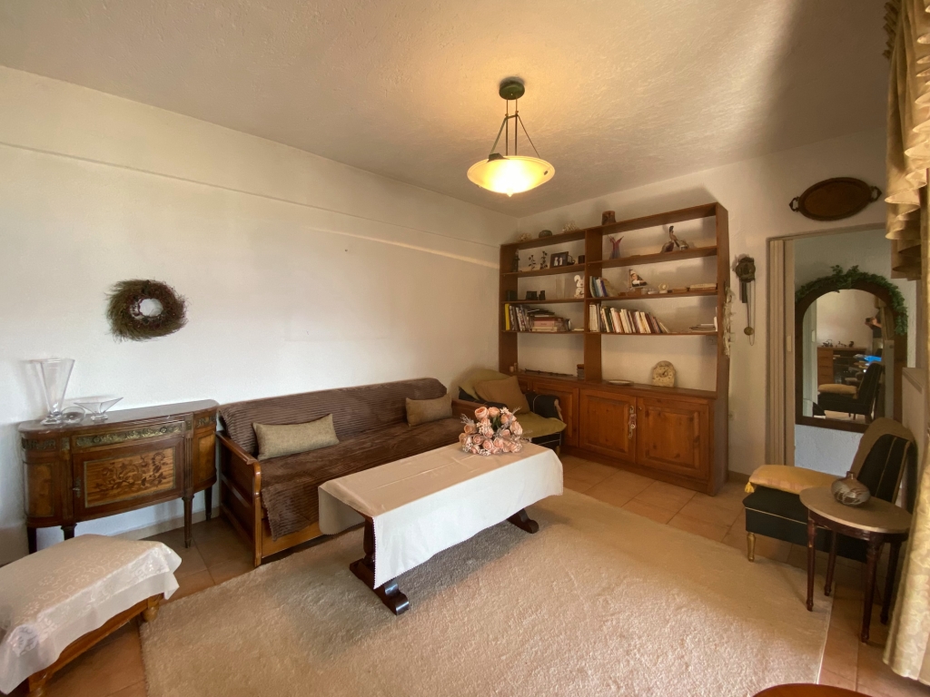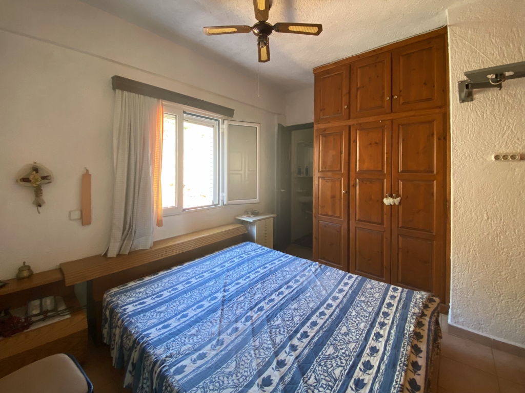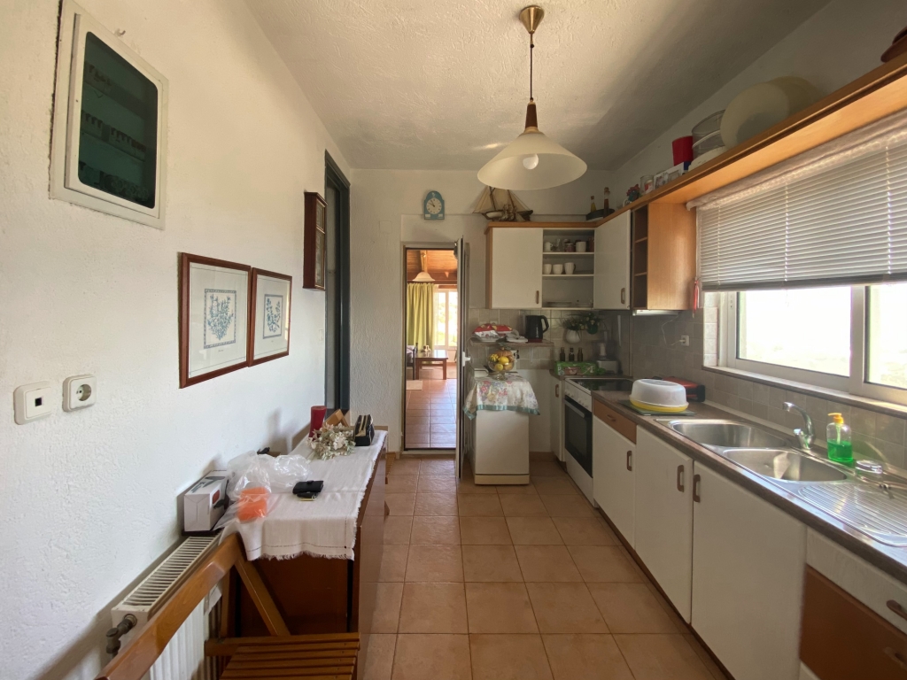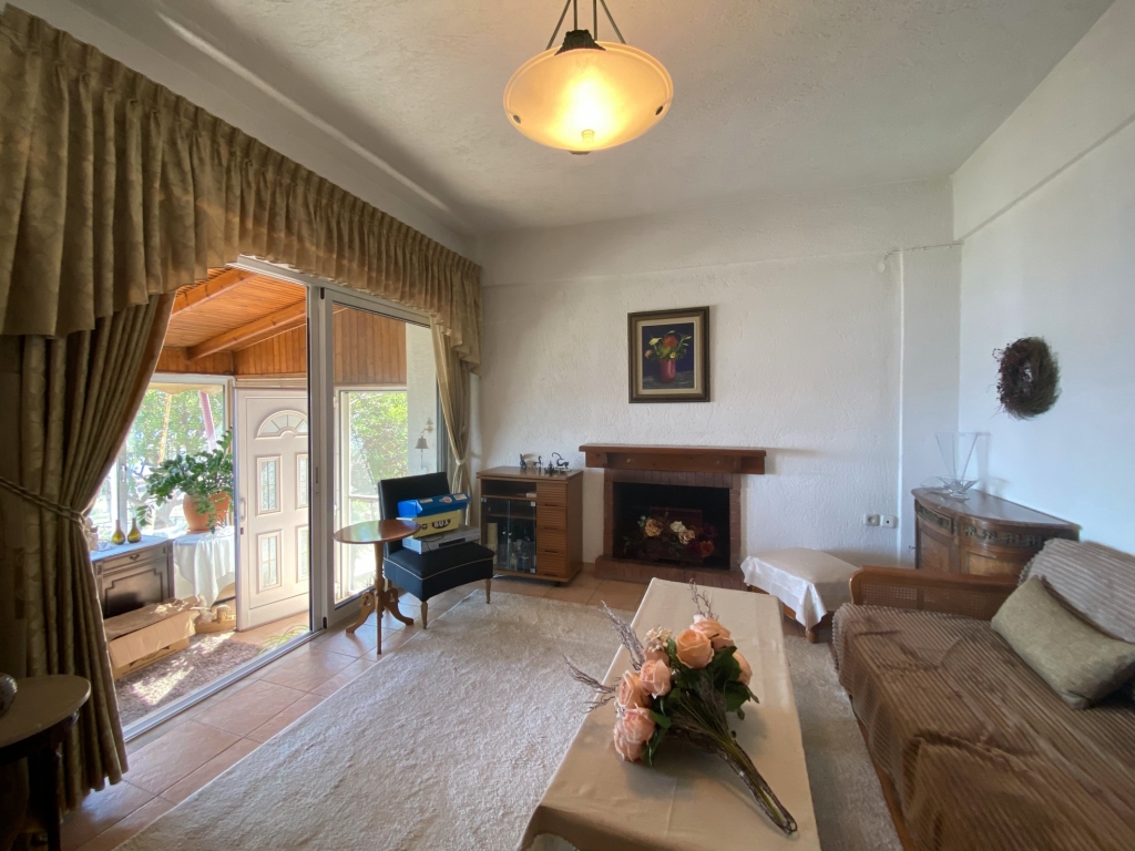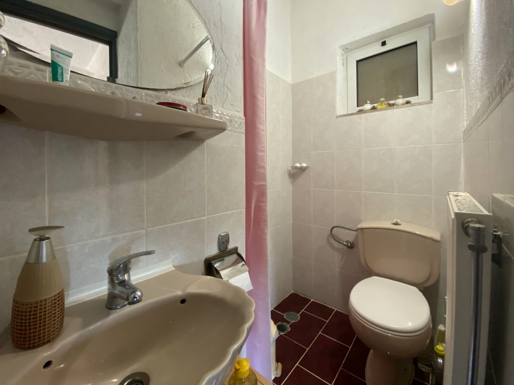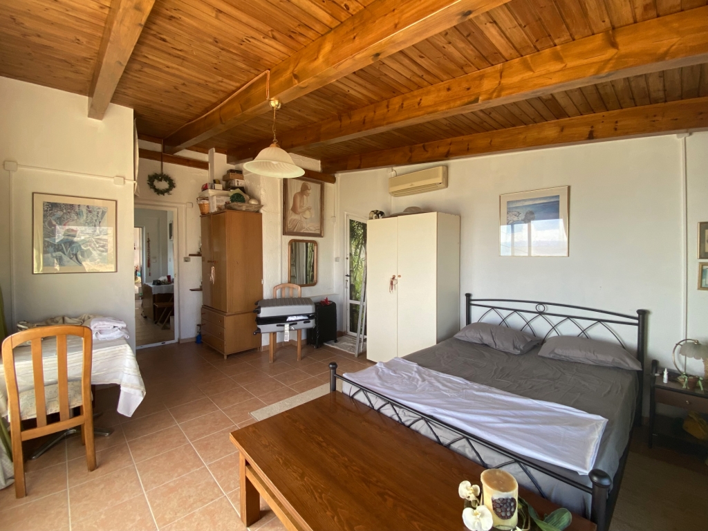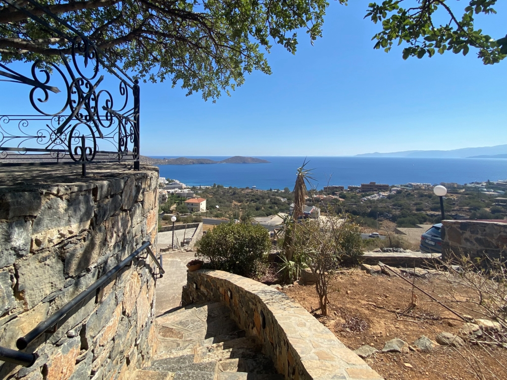 A detached house of 88m2 is available for sale just 350 meters from the beach and 9 km from the city of Agios Nikolaos, the capital of Eastern Crete. It is developed in a wonderful location within a land of 3.800m2 with the possibility of configuring the outdoor areas or cultivating the land as the new owner wishes. It opens to a hallway that leads to the kitchen, a WC and a bedroom with large windows offering an unparalleled view. Going up two steps we find the living room with fireplace and a bedroom with an en-suite bathroom. It includes a wooden ceiling, central heating, air conditioning and solar. Outside there is a closed barbecue area that also includes a wood-burning oven. For vehicles there is a closed parking space with a capacity of three vehicles and an open one for three vehicles. The panoramic view it offers makes it an excellent choice as a permanent or holiday residence even for its exploitation.