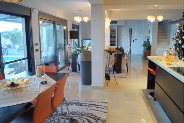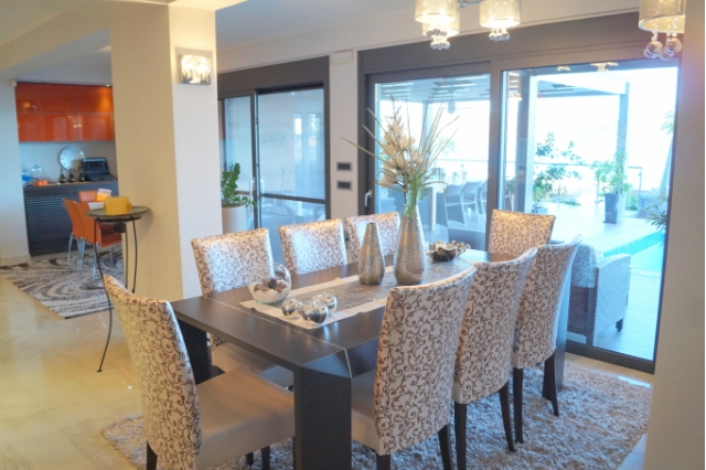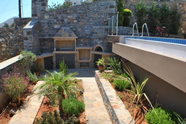 A luxurious villa of 250m2 is available for sale in a small complex close to the center of Elounda. It is just 100 meters from the sea,500 meters from Elounda, 8km from the graphic Aghios Nikolaos and 73km from the international airport of Heraklion. Ïn a plot of 500m2 it offers spectacular views of the village and the sea. The ground floor features one double sized bedroom, one bathroom and a large open plan living room with a fireplace, a modern fully equipped kitchen and a dining area. The lower floor comprises two bedrooms, two bathrooms a kitchen a big cloakroom and fitness area. The top floor consists of two double bedrooms and a bathroom. All the rooms in the villa have French style doors leading to the balcony or terraces with stunning views over the blue waters of Elounda Gulf and the distant mountains. Also, it includes central heating, solar water heating system, double glazing windows and fitted wardrobes and a large parking space under a pergola. The exterior of the villa is landscaped with a large pergola parking space, covered terrace with a BBQ and a small stone oven, a swimming pool and a garden. The villa is constructed with the highest standard and has been designed with privacy, serenity and comfort for the owners. This is an opportunity to purchase a villa in a prime location, in one of the most prestigious areas in Europe.